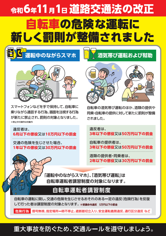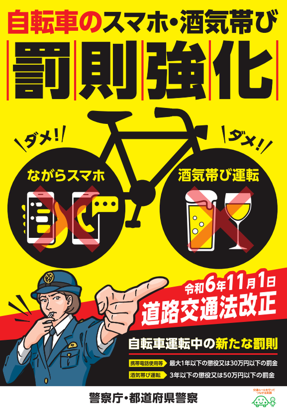 令和6年11月1日から道路交通法が改正されました。ながらスマホや酒気帯び運転は罰則の対象です。重大事故を防ぐために、交通ルールを遵守しましょう。