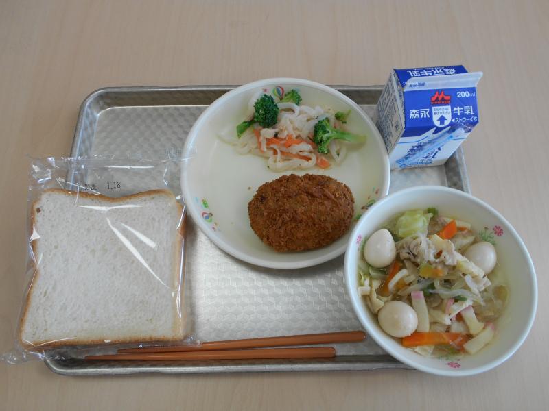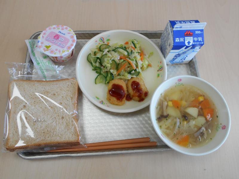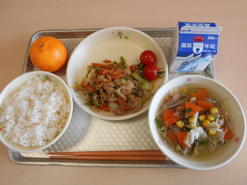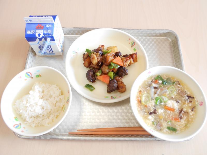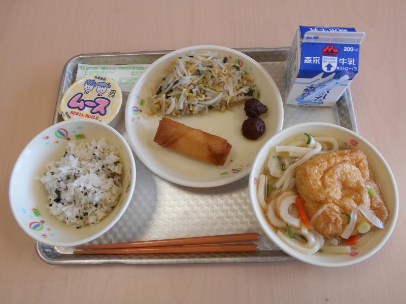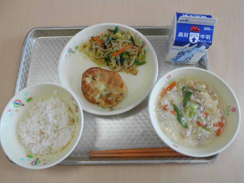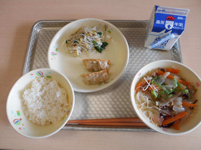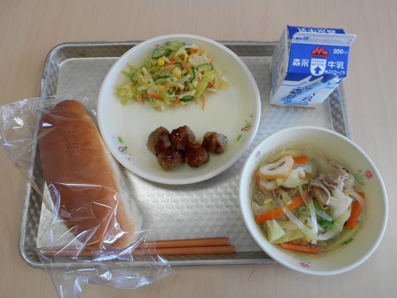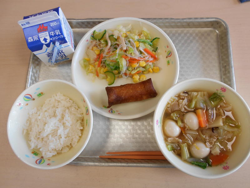 今日の給食、バンサンスウ?と春巻き、八宝菜でした。とてもおいしかったです。