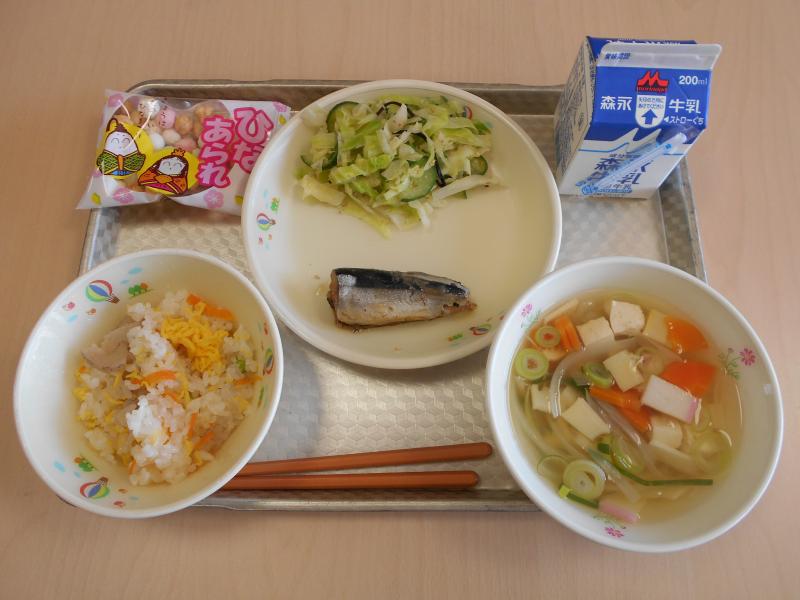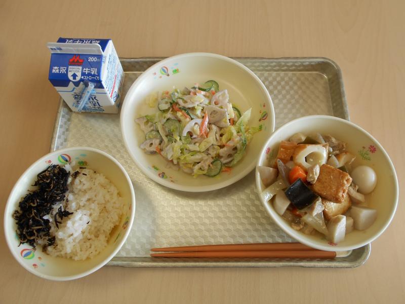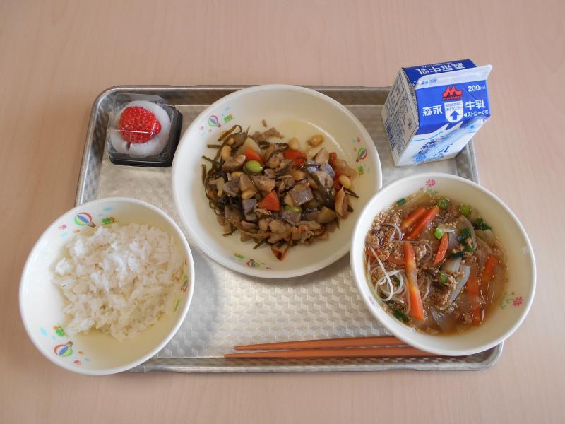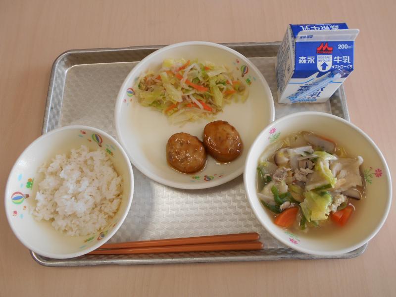 今日の給食です。つくねのおすまし、とっても暖まりました。いつもおいしい給食、ありがとうございます。