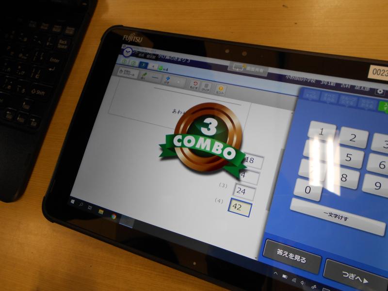 今日の5時間目に今年度初めてとなる研究授業が行われました。5年生の「小数のわり算」の小数÷小数の問題を解く授業でした。タブレットとミライシードというソフトを使った授業に挑戦しました。先生方の授業の準備もさることながら、子供たちも集中して、しかも楽しく学習に取り組んでいました。