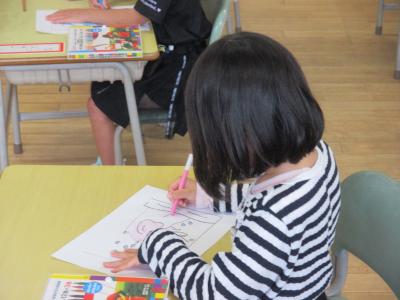 今日の授業では、数字や色の勉強をしました。写真は数字をたどって像さんを描き好きな色で仕上げたものを紹介している様子で。発表もとても上手にできていました。