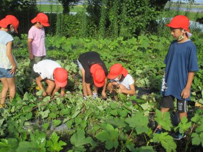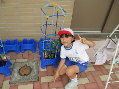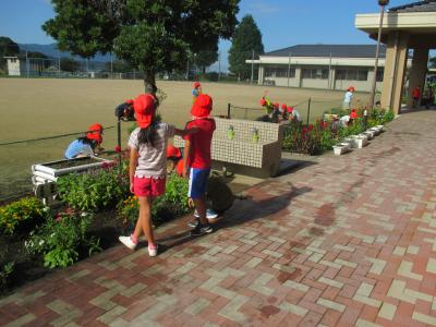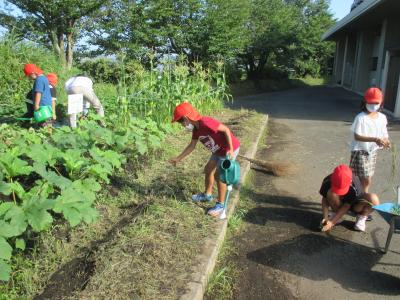 今日も快晴です。朝から上学年の子供たちは花壇や運動場の草取り頑張っています。3年生はいも畑の草取りやツルかえしを、2年生はトウモロコシとオクラのうねの水やりを1年生は花壇の草取りやミニトマトの水やりをそれぞれ頑張っています。みんな暑い中お疲れ様です。