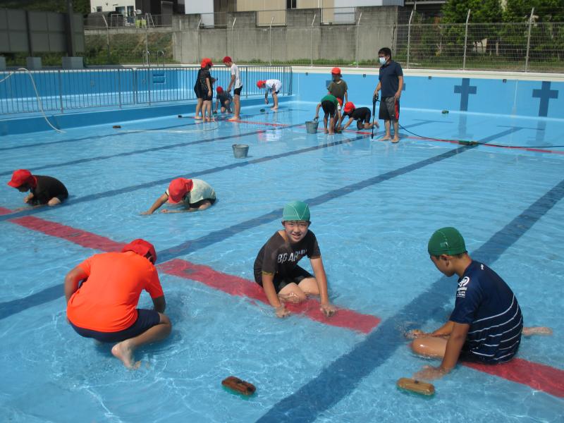 本日3時間目に3・4年生が、午後から5・6年生がプール掃除を行いました。今日は天気もよく、気温も高かったので、気持ちよく掃除ができました。プールもとてもきれいになりました。