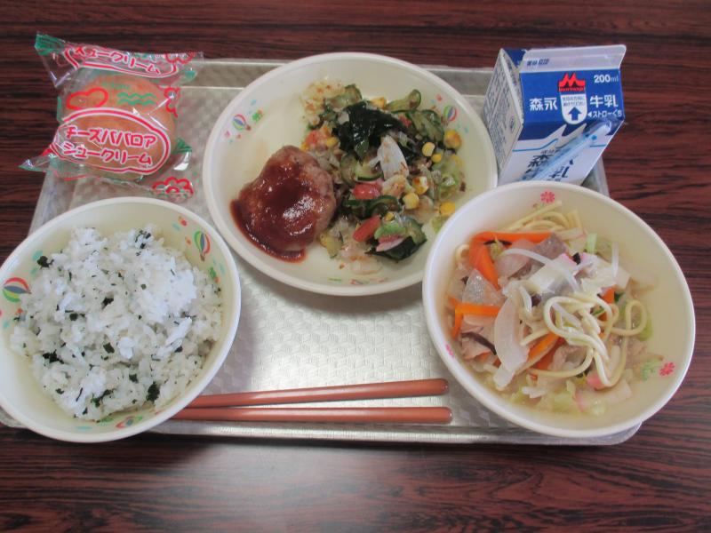 今日は3年生のリクエスト給食でした。チャンポン、ハンバーグ、デザートのババロアシュークリームなど子供たちが喜ぶ品ばかりでした。私もおいしくいただきました。