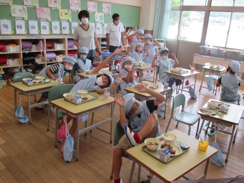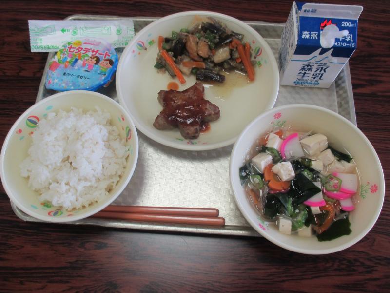 今日は七夕ですね。給食では、七夕にちなんで、星型ハンバーグやデザート、星型にきざんだ人参などがでました。とてもおいしかったです。子供たちにも好評でした。給食の先生方に感謝。(写真は2年生です。)