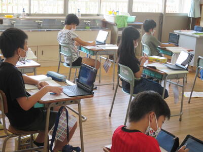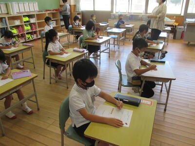 今日から前期後半が始まりました。新型コロナ感染症対策を行いながらのスタートです。子供達も元気に登校してきました。初めの写真は1年生の授業の様子です。後方の棚には夏休みの宿題も提出されています。日記も見ましたがかわいらしくてほっこりしました。今日は4時間授業で最後は一斉下校で帰りました。