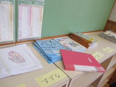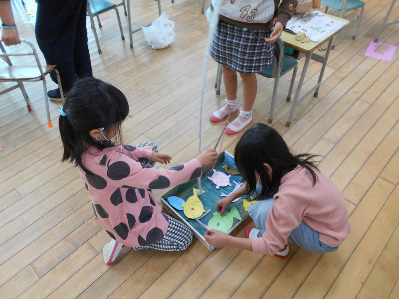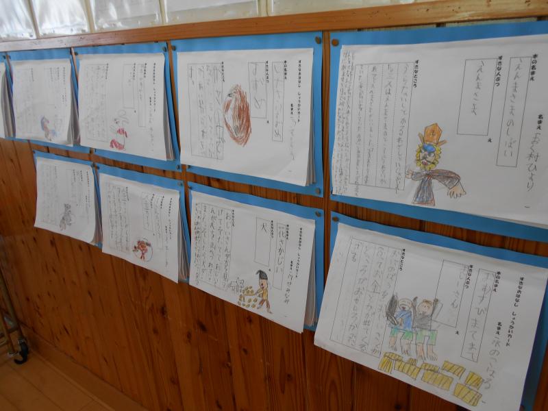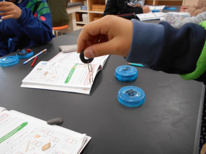 1年生では生活科で「秋のおもちゃをつくろう」に取り組んでいました。松ぼっくりと紙コップを使った「けん玉?」や、木の枝の釣り竿で、紙で作った魚を釣り上げていました。「校長先生も釣ってください!」と勧められたので、廊下から窓越しに見事、ピンクの大きな魚を釣り上げさせていただきました。釣り針に当たるのは磁石かと思いきや、何と「おなもみ」でした!。 まさに「秋」を感じる「まなび」でした。