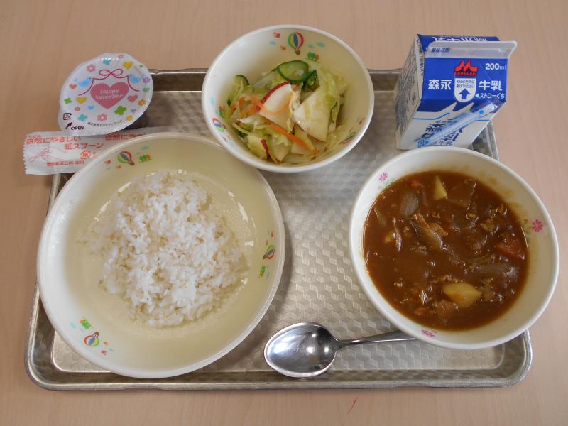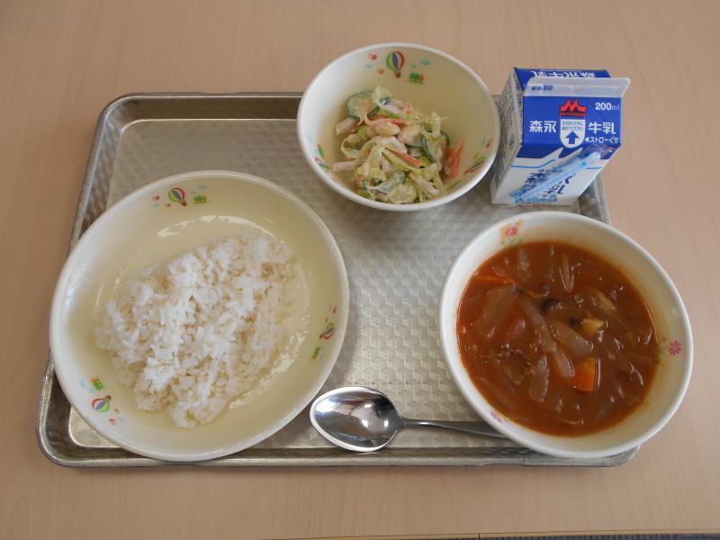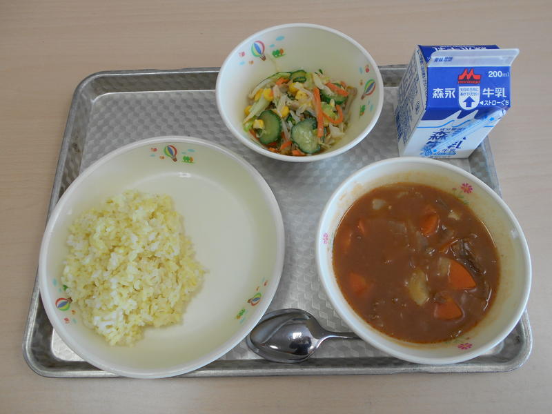 今日の給食です。ビーフシチューですが、ご飯はバターライス。なんと、バターを入れてお米を炊いた後、さらにもう一度混ぜあわせるという、とても手の込んだメニューでした。いつもおいしい給食をありがとうございます。