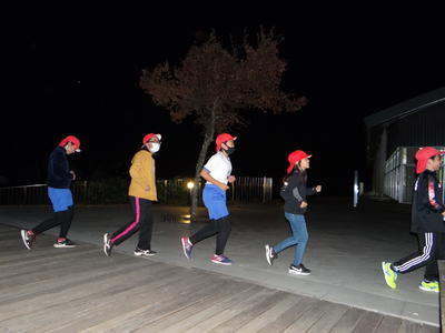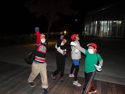 午後7時30分、きれいな夕日を眺めた後で待っているのは、「ナイトゲーム」です。4~5人組の班別に、広大な敷地内を「3つのミッション」をクリアしてゴールとなります。懐中電灯だけが頼りです。途中、何が出るかは楽しみです。無事帰れることをお祈りいたします。では、「行ってらっしゃ~い」。また、ゴールした後は「怪しい深夜の行進」?が繰り広げられました。