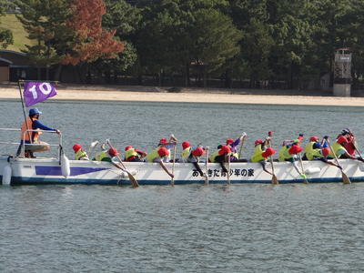 朝食後、部屋の後片付けをして、全員元気に活動に向かいます。今日も天気に恵まれ、快晴! 日焼けしそうなくらいジリジリとした日差しの中で行われるのは、最後のプログラム「マリン活動」です。各校それぞれのペーロン船に乗船して、水俣の大海原へと船出していきます。