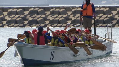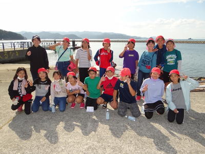 初めてとは思えないほどの「櫂さばき」で、2校対決の勝負は、我が小野部田小僅差で勝利しました。下船した後は昼食まで時間があり、自由行動となりました。そんな中、冨田先生が大きな「ガラカブ」を見事つり上げました!? 真相は・・・? 最後に海をバックに、はいパチリ!