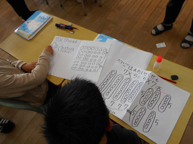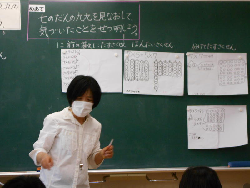本日は2年生の算数で授業研究会を行いました。算数の「九九をつくろう」と言う授業でしたが、「7の段」を使って行う授業でした。導入の段階から、「どんな作戦を使って考えるか?」という授業で、自分のにとっては、ただひたすら九九を暗唱し、1から9の段までノーミスでないと帰られないという、苦痛の思い出しかありませんでしたので、興味を持って参観することができました。
