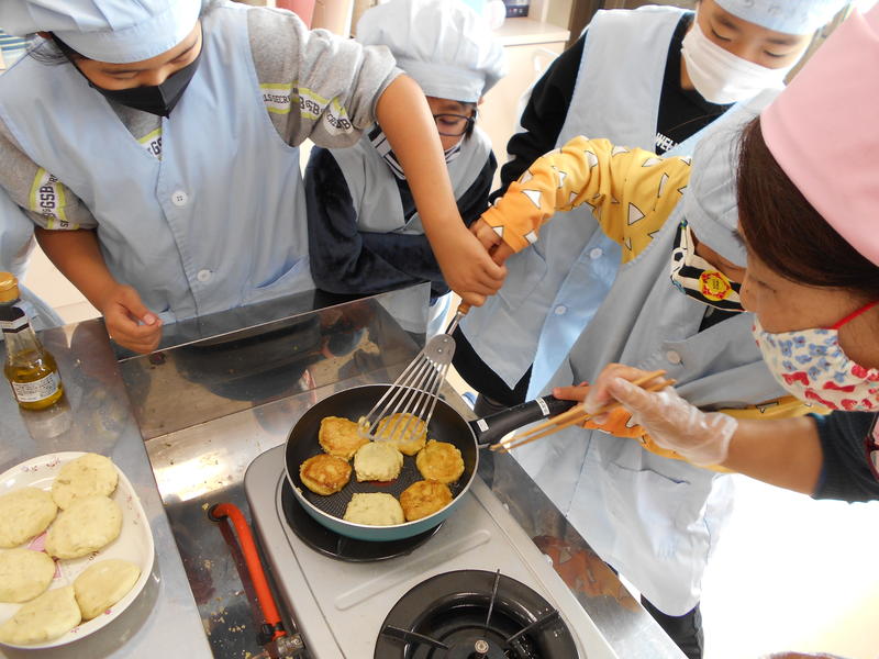 では、実際に焼いてもらいましょう! 大丈夫かな? 「もっとこっちに移して!」とか、「もう裏返した方が・・・」など、さまざまな指示が飛び交います。