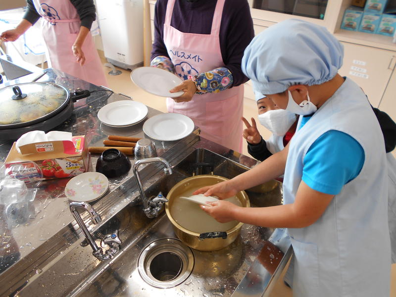 みんなで食する前に、「お片付け」です。鍋の底や台の上も、ていねいに拭き上げます。お家での成果が発揮されるときです。