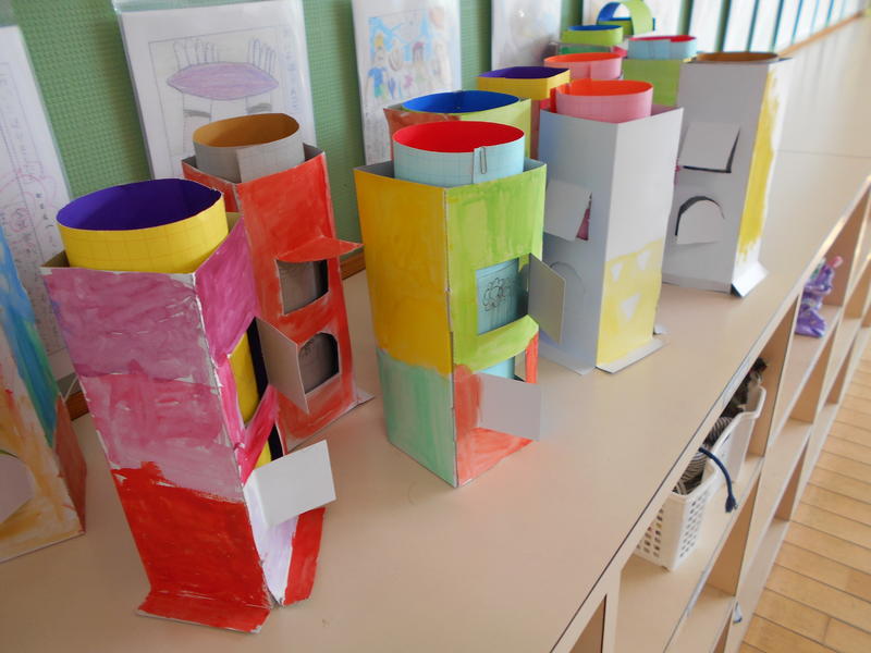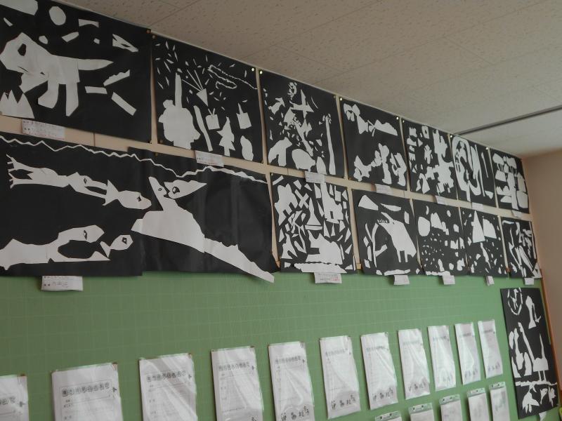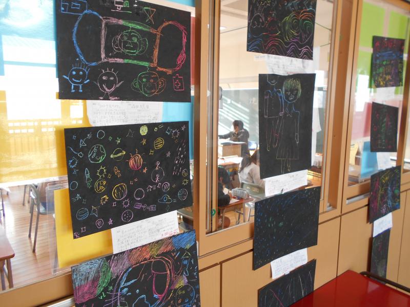 今日は各学年の掲示物や作品等に目を向けました。まずは2年生、「窓を開いて」というカッターナイフを使う題材のようです。まだ作成中ですが、カラフルな建物が並んでいます。