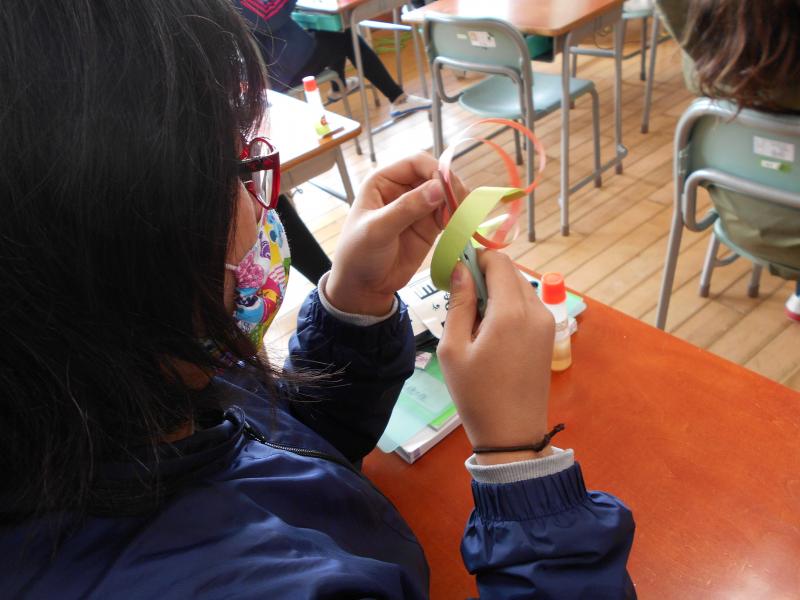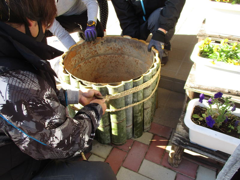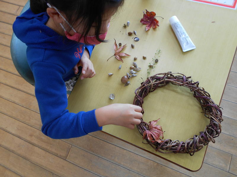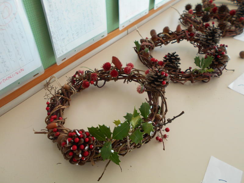 1年生がクリスマスに向けて、リースづくりを行っていました。以前紹介した芋の蔓でできたリースに、思い思いの飾り付けをしているところでした。材料は自然のものしか使わないとのことで、各家庭から花や松ぼっくりなどを調達していたようです。