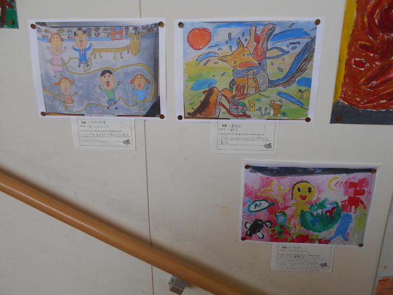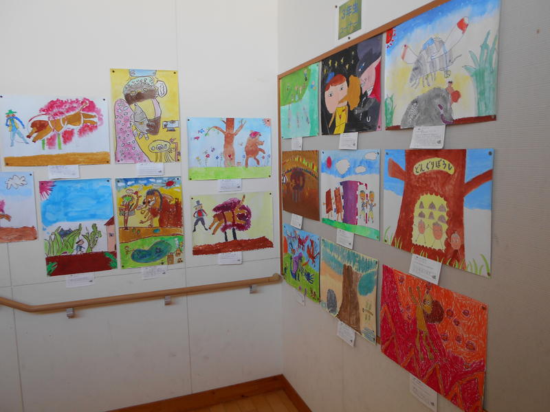 階段を上ろうとすると、3年生の掲示物コーナーに「読書感想画」が張られていました。