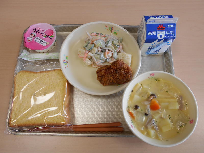今日の給食です。唐揚げ、最高! 子どもたちも大好きなメニューのようです。