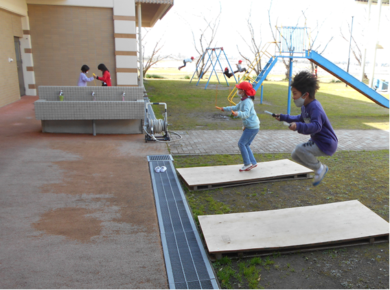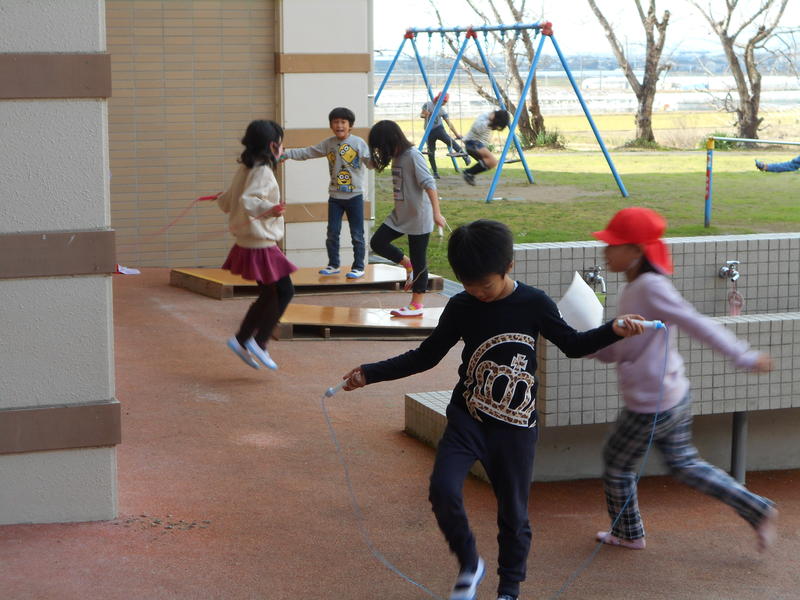 お昼頃は、ちょっと暖かくなりましたね。昼休みの運動場は、たくさんの子どもたちであふれかえっています。2年生を中心に、今流行っているのは「縄跳び」のようです。中庭では、2段跳びの練習に一心不乱に取り組んでいます。
