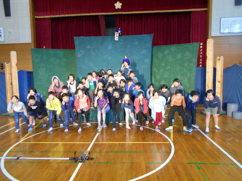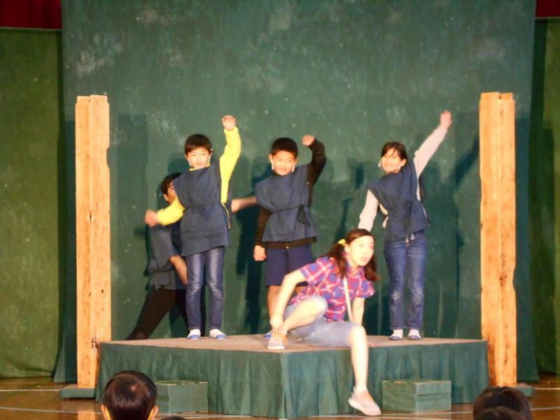 ワークショップ形式で行われる劇中に、3年生と4年生が出演し参加していきました。誰一人照れることもなく、堂々と演技してくれました。