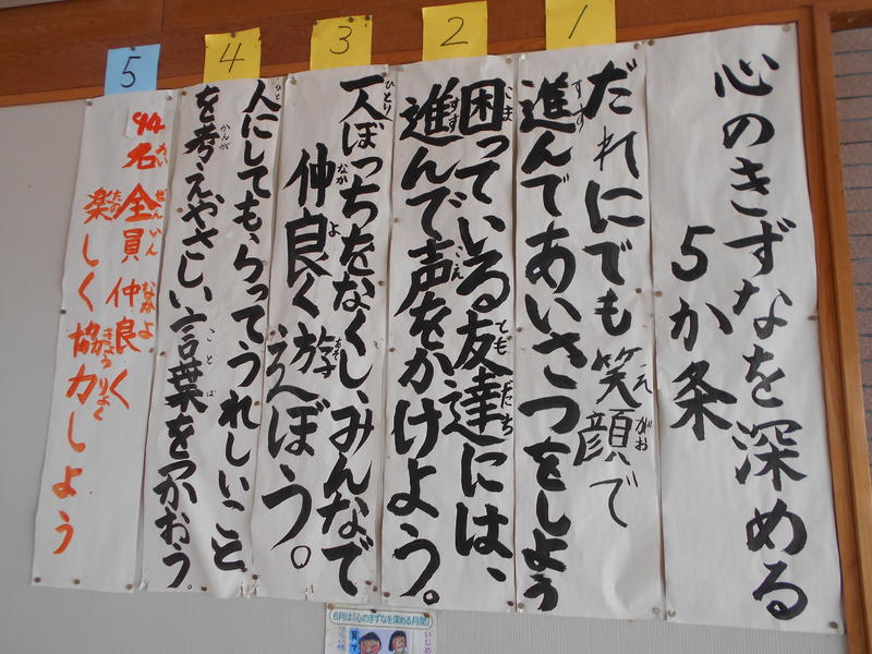 まず目にとまったのは、子どもたちが毎日登下校する昇降口の壁に、大きく貼りだしてありました。「誰にでも笑顔で・・・、独りぼっちをなくし・・・、全員仲良く、楽しく協力しよう」とありました。私自身の不安が、少し取り除かれたような気がしました。