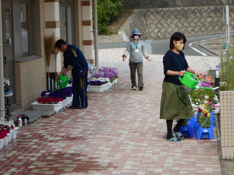 次は外へ出てみました。すると、先生方が協力して、花壇やプランターの花に水をまいておられました。臨時休校中、子どもたちがいない間、ていねいに管理をされていました。ある先生の今年のモットーは「花いっぱいの学校を目指す。」と宣言していただきました。