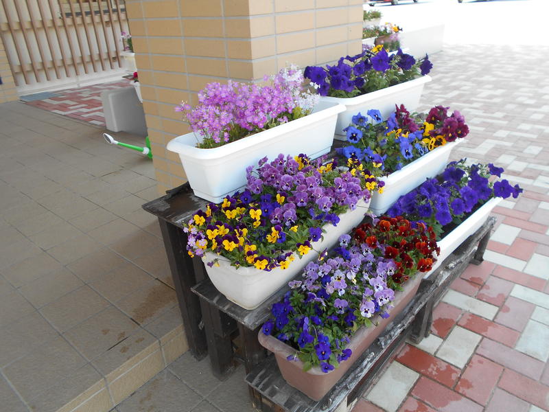 校内を見回すと、正面玄関の前に、見事に桜の花が咲き乱れていました。また、正面玄関の前のプランターにも、たくさんの花が咲いていました。