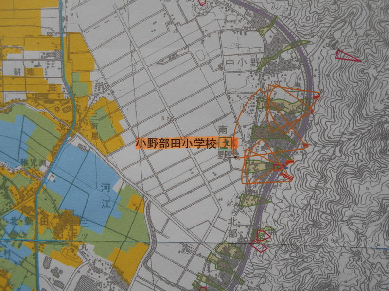 宇城市のハザードマップを校区だけ印刷し、校長室に掲示しました。これを見ると、この小野部田校区は津波の心配よりも、土石流の警戒区域の多さにびっくりしました。もしも・・・の場合は、本校も避難所となるので、さまざまなことへの対応が必要となります。