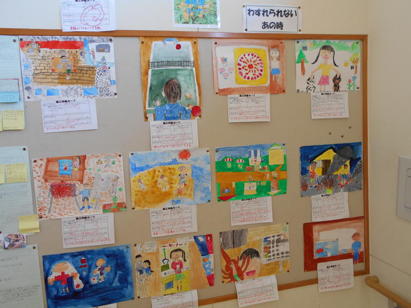 階段ホールの4年生のコーナーには、早速「夏休みの思い出」が掲示されていました。家族で映画を見たり、お菓子作りをしたり、海水浴へ行ったことなど、たくさんの思い出が紹介されていました。短いなりに充実していたようです。