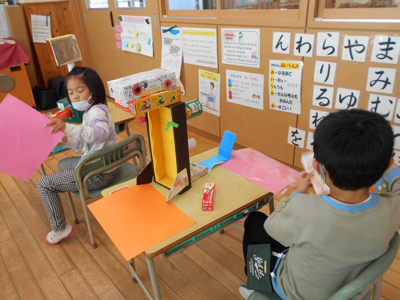 今日は、授業の様子をちょっとだけ。1年生では図工の時間に「はこをつかって」作品を仕上げていました。中には、ゴジラを立体的にイメージした超大作にチャレンジしていたり、他にもウサギなどかわいい作品も数多く誕生していました。完成が楽しみです。