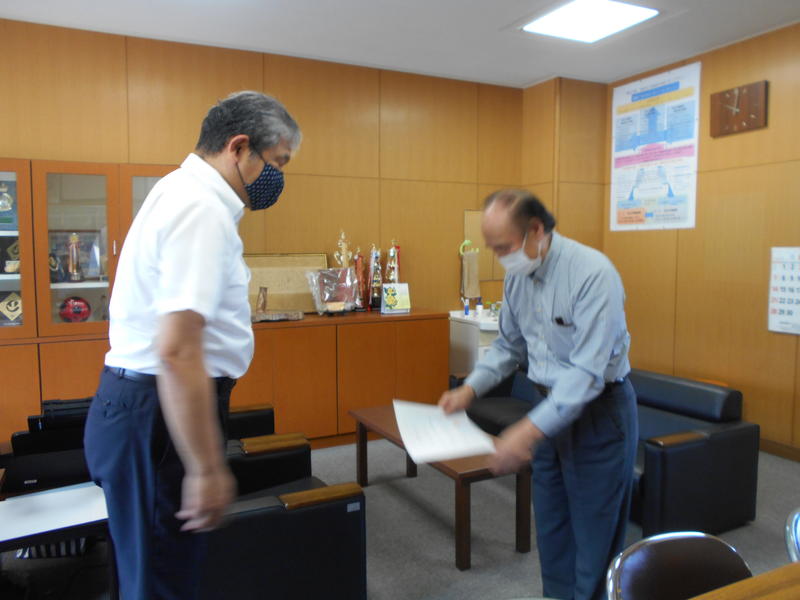 本日は、かねてより延期していた「学校関係者評価委員会」の第1回を、ようやく開催することが出来ました。給食試食会の後に会議を行いましたが、会に先立ちまして、私の方から各委員様に委嘱状をお渡ししました。代表して岩山勝也様に直接お渡しすることが出来ました。