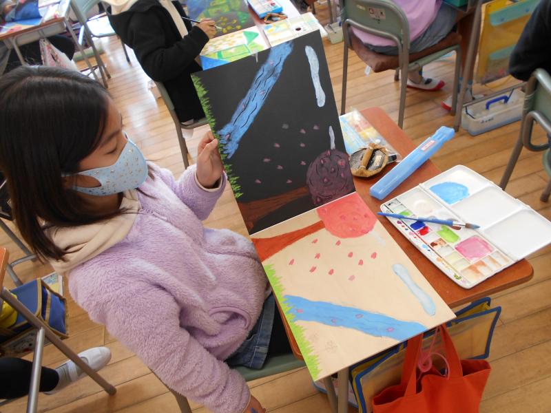4年生の教室では、木版画の本刷り作業が行われていました。個性的な色使いやシュールな絵が多く、完成が楽しみです。