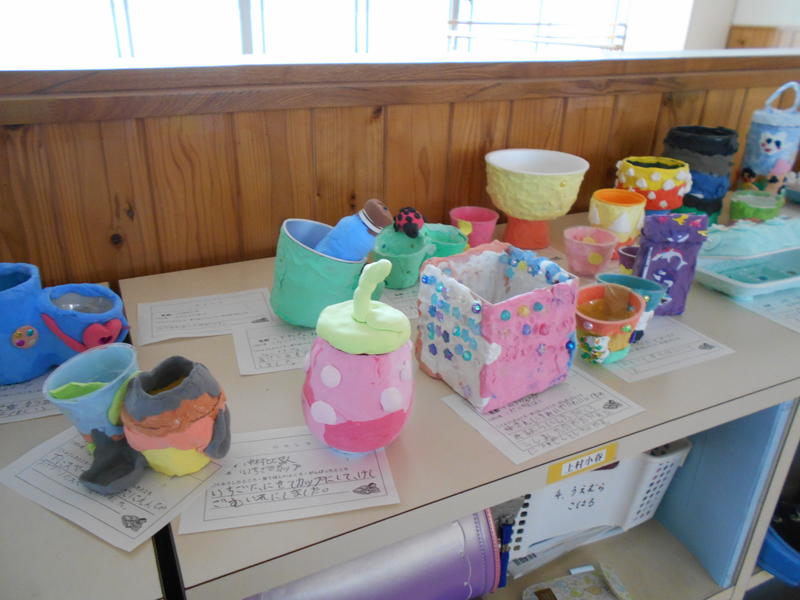 3年生は「空き容器の変身」です。ガラス瓶等にパステルカラーの紙粘土を貼り付けて、上手に作ってありました。