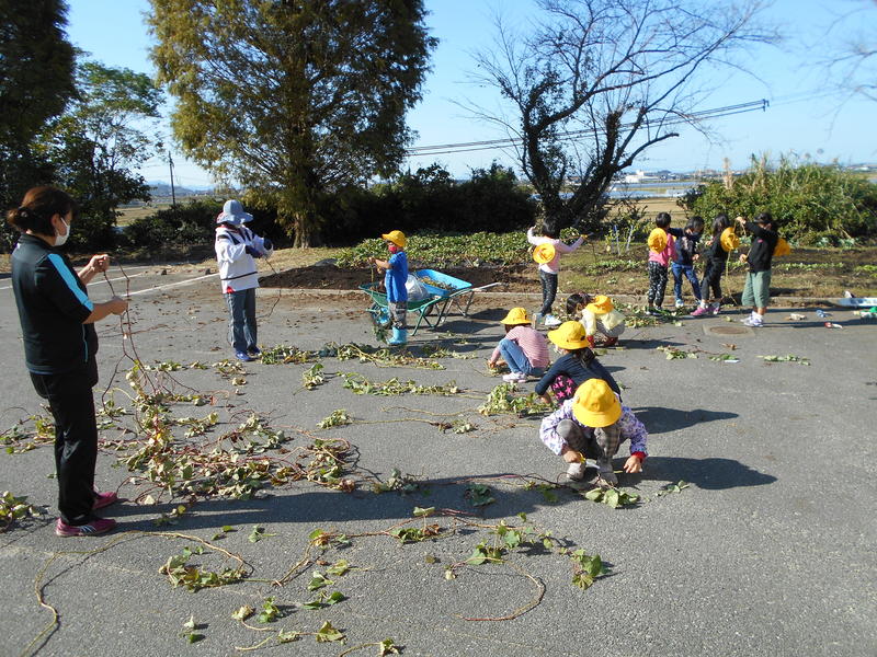 写真は収穫した後の芋の蔓を、ていねいに整えているところです。今後、クリスマスに向けてリースづくりをするときの材料となるそうです。どんな独創的なリースができるのか、これもまた楽しみです。