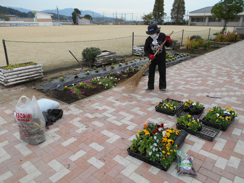 「小野部田女性の会」の方々が、玄関前の花壇とスロープの花を植え替えに来ていただきました。今回は、「パンジー、ビオラ、ノースポール、キンセンカ」を持ってきていただきました。寒い中、本当にありがとうございます。