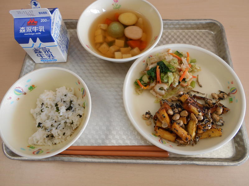本日の給食です。「ミックスかりんとう」は手の込んだ給食室の手作りで、とてもおいしかったです。栄養だけでなく、さまざまな工夫をしていただき、いつもありがとうございます。