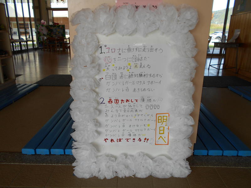 本日から、児童昇降口には赤団と白団の得点ボードが掲示されています。中には各応援団歌の歌詞が張られています。給食中にも毎日放送されています。私も気がつくといつの間にか「ガンバレ、ガール・・・」と口ずさんでいます。