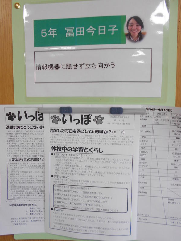 ところで、もうすでにご覧になっているかと思いますが、各学年の学級便りです。それぞれの担任の思いが、詰められたものですので、必ず親子でご覧いただくようお願いします。また、校長室の壁にも全クラスの学級便りを掲示しています。私自身も楽しみに待っています。