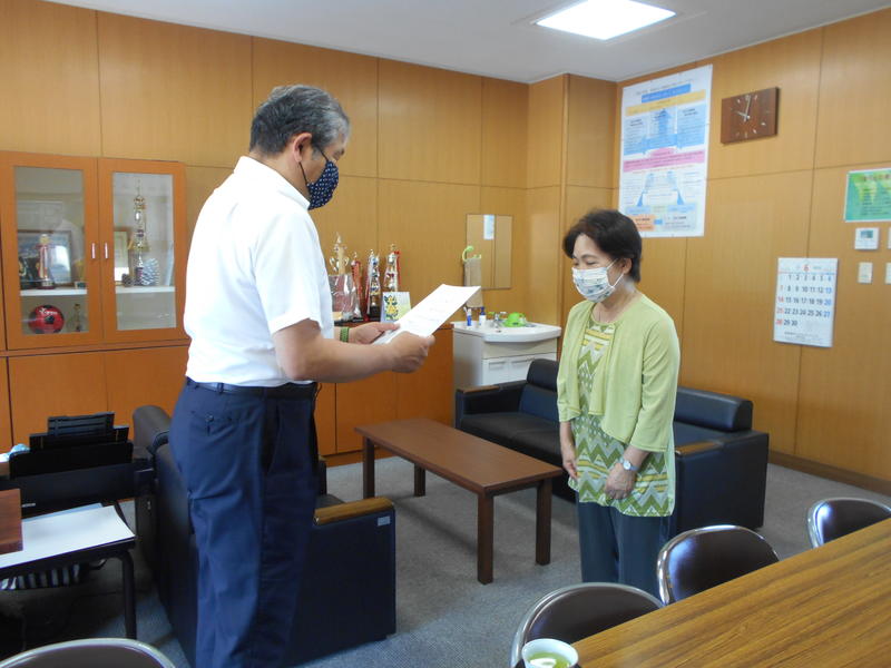 本日は、かねてより延期していた「学校関係者評価委員会」の第1回を、ようやく開催することが出来ました。給食試食会の後に会議を行いましたが、会に先立ちまして、私の方から各委員様に委嘱状をお渡ししました。代表して岩山勝也様に直接お渡しすることが出来ました。