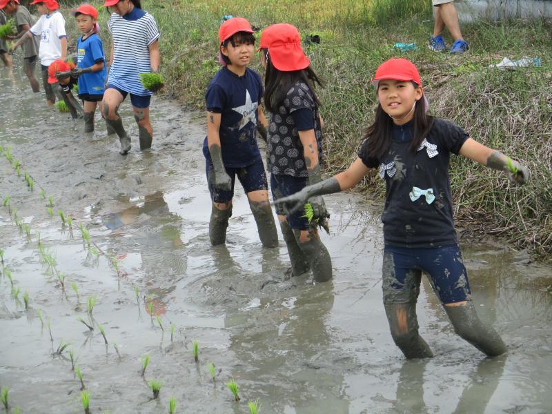 今日の5・6時間目に5年生が総合的な学習の時間の「調べよう!米、そして水のこと」の学習で田植えに出かけました。ライスセンターのみんさんの協力のもとご覧のように田植え体験をしました。今後の稲の成長が楽しみです。