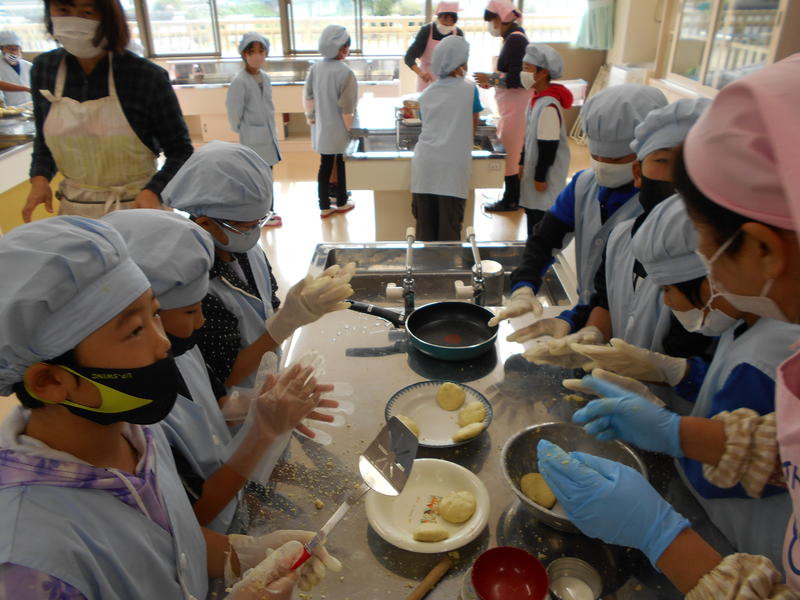3年生が家庭科室にやってきました。すでにつぶしていただいている芋を、みんなで丸めて形を整えていきます。なかなかうまく丸くならずに、かなり苦戦しているようです。
