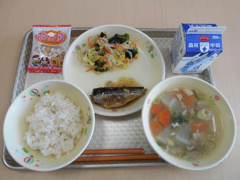 今日の給食です。「コロナ~外! 福は~内!!」ですね。
