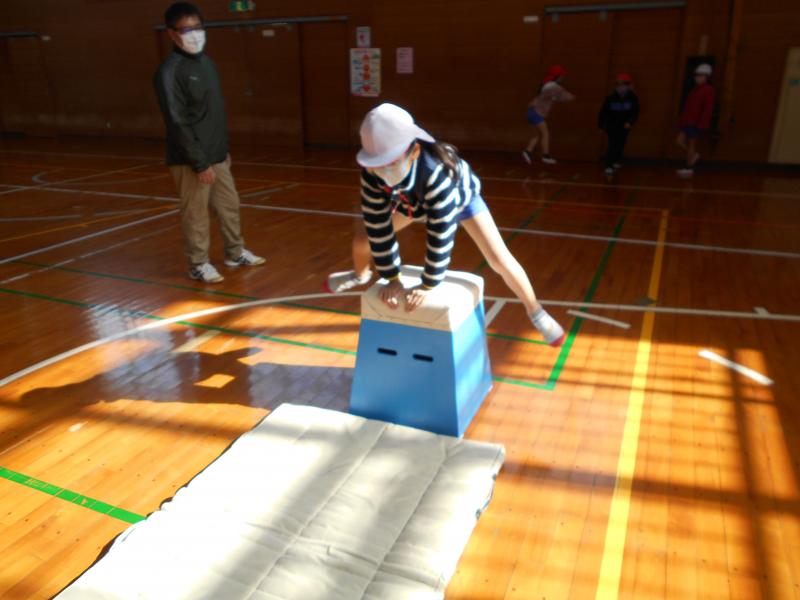 さて、3年生では体育で跳び箱に挑戦していました。体育館に行くと、ひとつだけ普通の跳び箱と違い半分の大きさで、なおかつ手をつくところに「手形」が示されています。「なるほど・・・、これは工夫してある。」と思っていたら、見ているわずかな時間で、苦手だった子が見事跳べるようになりました!! 教材・教具の工夫と指導方法の改善、そして「魔法のことば」がとっても大切なことだと、あらためて認識しました。