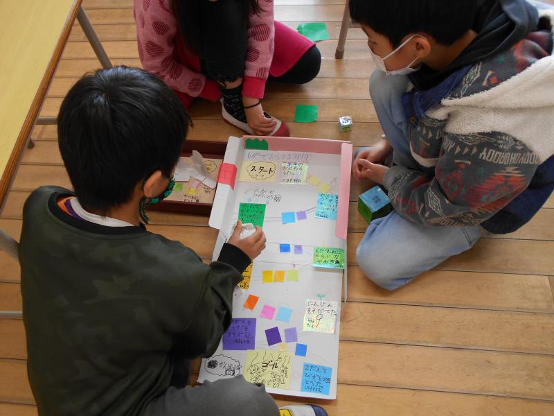 2年生は図工で「わくわくすごろく」で盛り上がっていました。中には「プールで泳いで水が鼻に入った、1回休み」など、面白い「指令」が組み込んでありました。