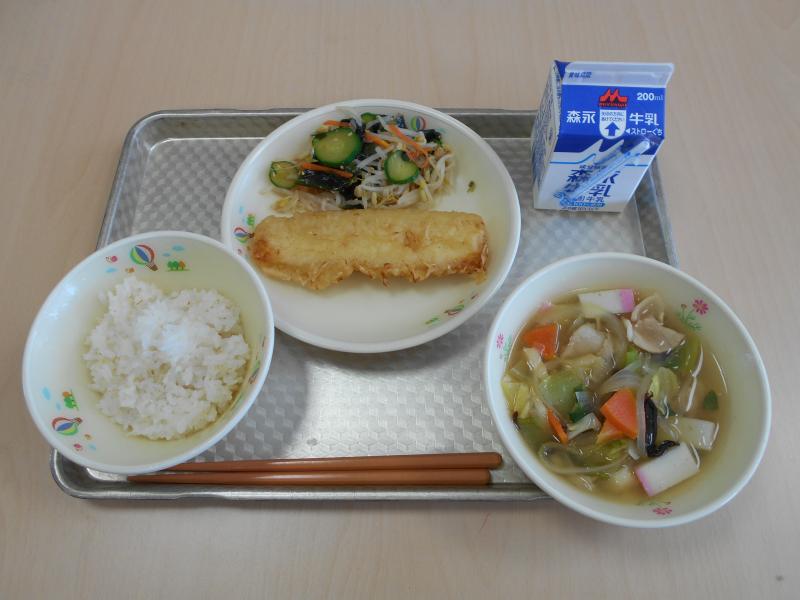 今日の給食、こんなにでっかくて柔らかいイカのてんぷらでした。ごちそうさまです。