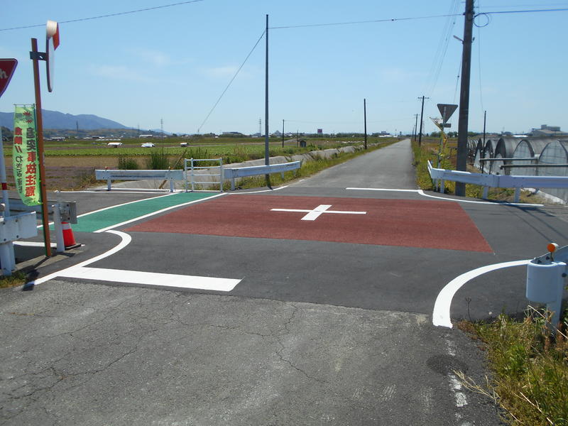 この交差点は、半数以上の本校児童が登下校で通ってくるところです。一見、見通しがよいので危険性はないようですが、じつは、こんな交差点が「田園型交通事故」の多発するところだそうです。どちらのドライバーからも、お互いにスピードが止まって見える「コリジョンコース現象」が起こるそうです。