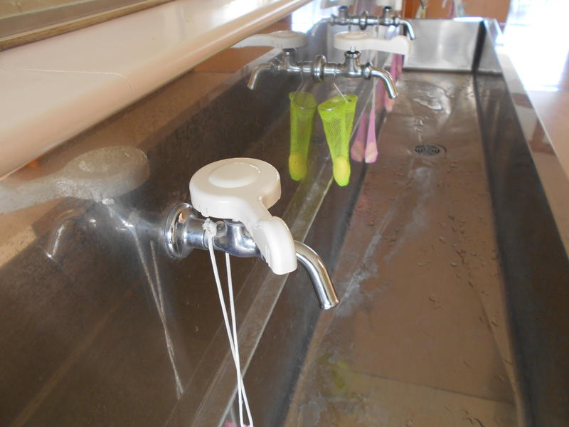 手洗い場の蛇口に、簡易式のレバーをつけました。用務の楠本先生に、100円ショップから探してきていただきました。なかなかの優れものです。恐るべし、100均!!