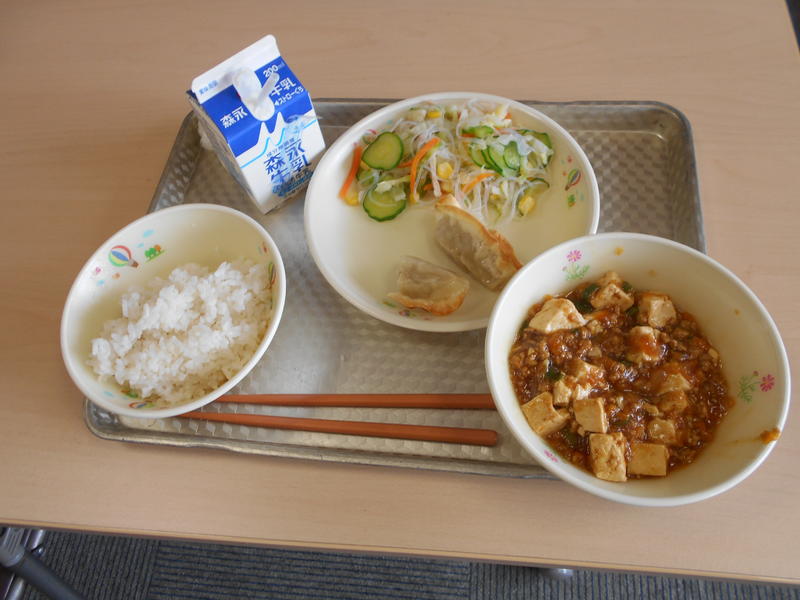 うれしかったのは、給食が始まりました。私の楽しみ?のひとつです。今日は麻婆豆腐です!!。