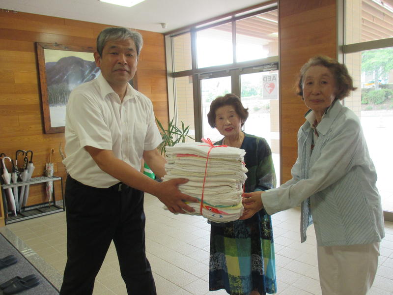本日、老人会の会長である江村英子様と同会会計の北側マサエ様が来校され、手作りの雑巾を50枚いただきました。