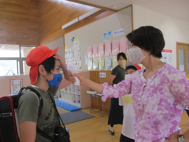 これから毎日登校後、検温とともに健康観察を行います。本日は検温忘れは少なかったようです。各家庭での「習慣化」をお願いします。これは教頭先生が非接触型の体温計で計測しているところです。